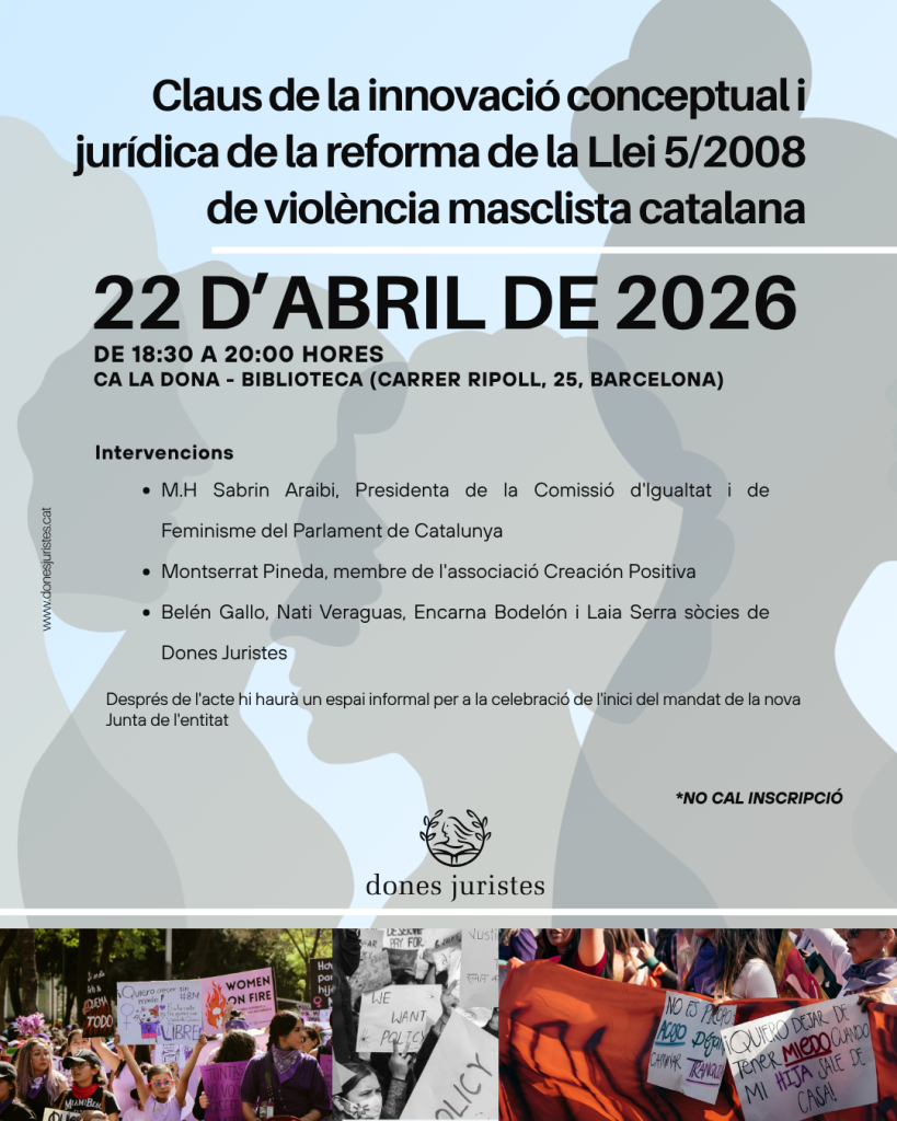 Us informem que el proper 22 d'abril de 2026, de 18:30 a 20:00, tindrem a Ca la Dona una sessió de debat sobre les claus de la innovació conceptual i jurídica de la reforma de la Llei 5/2008 de violència masclista catalana.